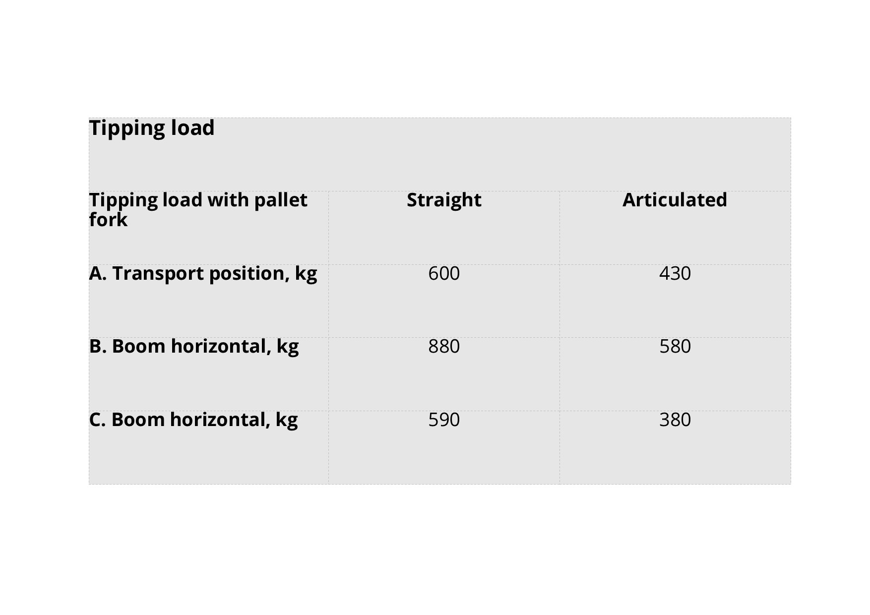 • Tipping load, articulated (kg)…..490